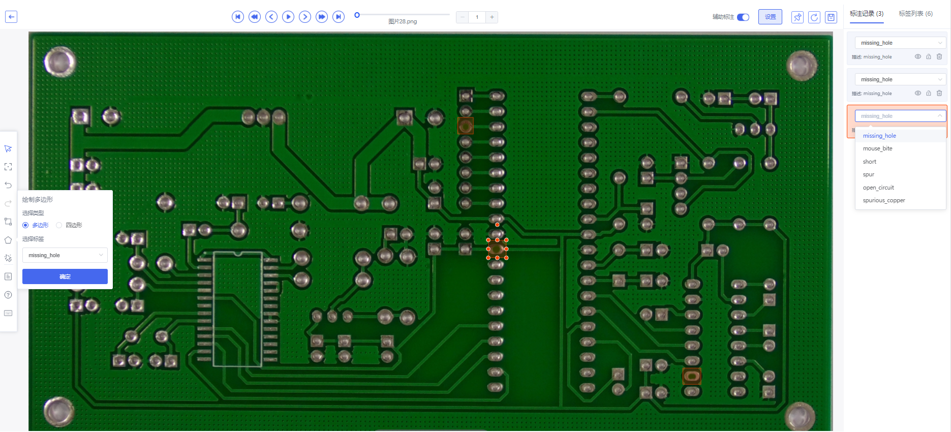 选择标签并确定(鼠标将进入绘制状态)。Step2: 在标注工作台图片上多处右击鼠标画点绘制多边形。