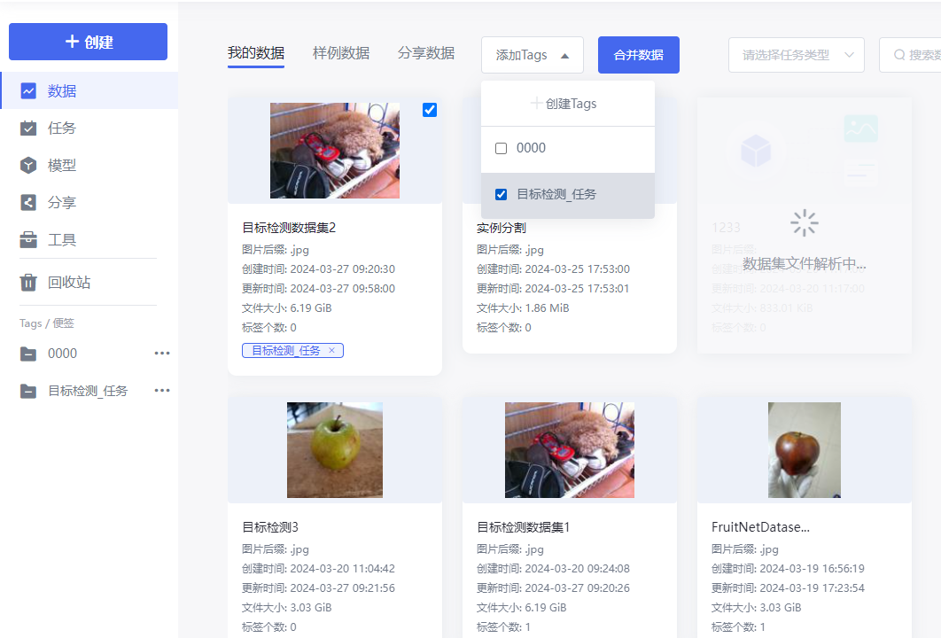 Coovally系统支持用户对自有和分享数据集、任务、模型添加Tag。添加Tag后,用户可分类查看并管理数据集、任务、模型。