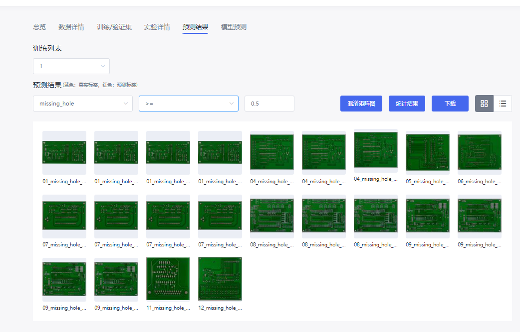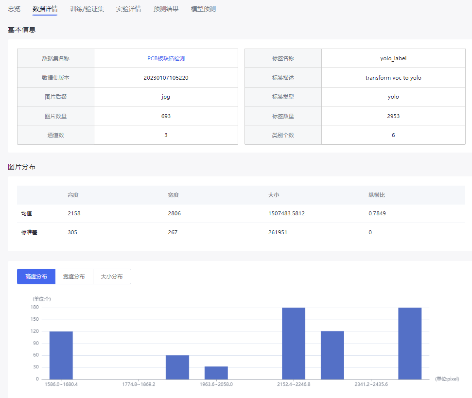 实验详情tab页主要显示执行此模型训练任务使用的数据集 & 数据集标签信息(此处以PCB板缺陷检测任务为例)。
